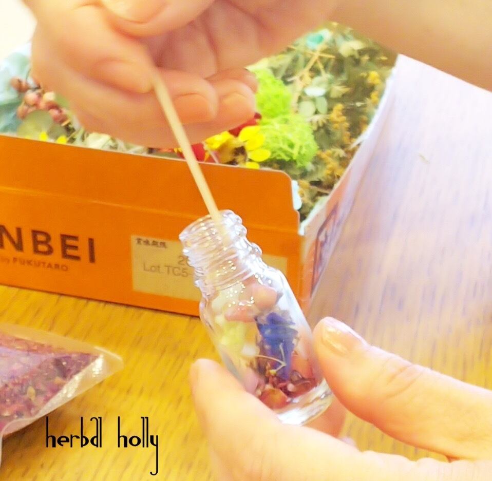 10mlのボトルの中にドライフラワーとホホバオイル、香りとお花のエッセンスが入っています。